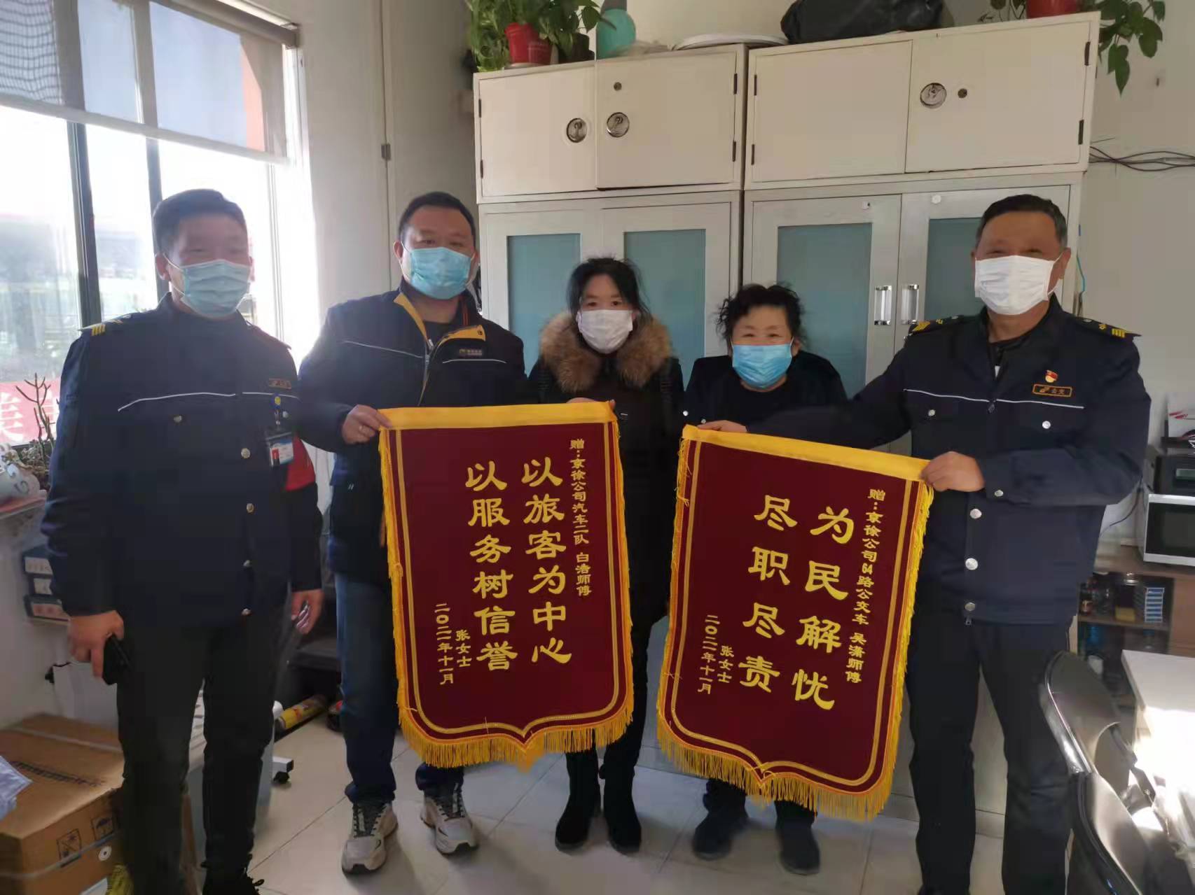 11月11日上午,乘客張女士帶著兩面錦旗來到食品城車隊,感謝64路駕駛員吳瀟和現(xiàn)場調(diào)度白浩。