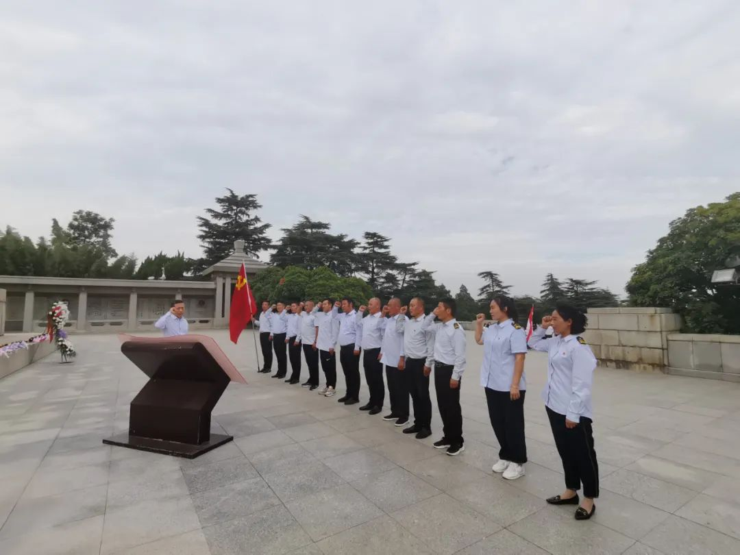 淮海戰(zhàn)役烈士紀(jì)念塔坐落在徐州市市南郊鳳凰山東麓,面向朝陽,巍然聳立。黨員們懷著無比崇敬的心情,在烈士紀(jì)念塔前整齊列隊(duì),神情肅穆,向烈士默哀致敬!