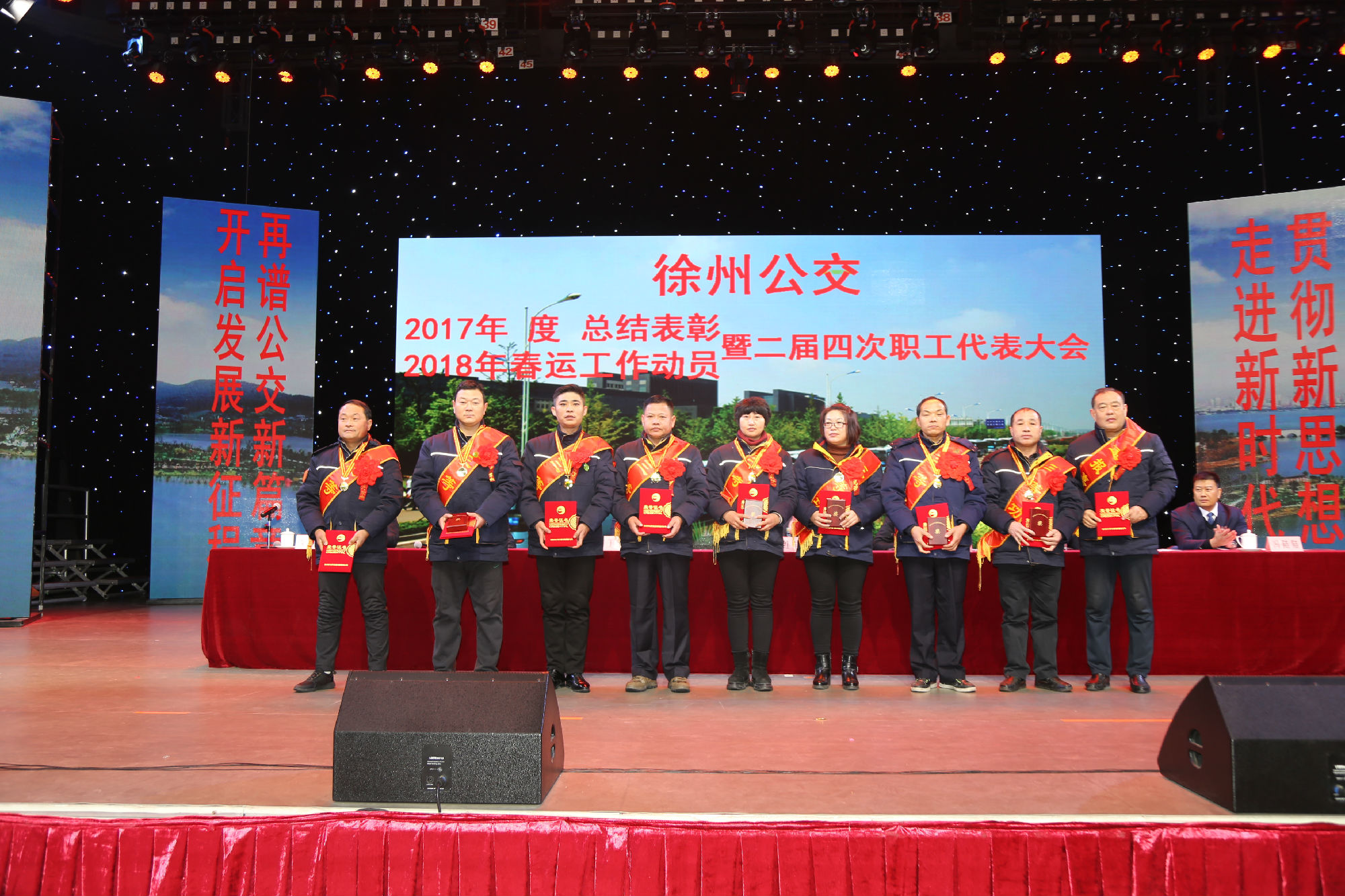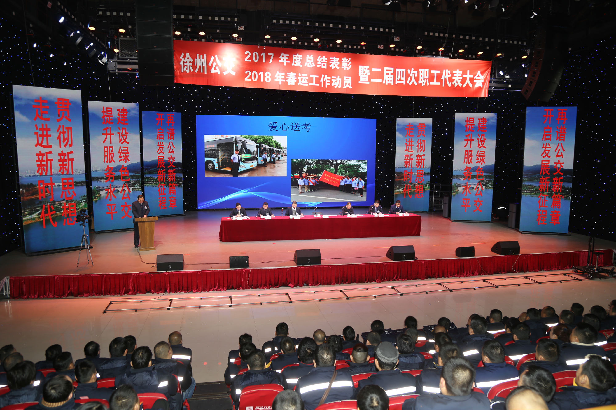 大會在莊嚴的國歌聲中拉開序幕。公司董事長、總經理杜紅軍首先作經理工作報告,對2017年“改革創(chuàng)新年”工作進行了全面總結:一、實施“同城同價”,優(yōu)化運營管理,實現服務水平新突破。連續(xù)第五年面向全市征集線路線網優(yōu)化意見近3000條,據此新辟優(yōu)化線路29條。二、深化資源共享,在互聯(lián)網+企業(yè)管理上譜寫新藍圖。繼續(xù)深化集中維修,推行集中例檢。論證實施支付寶、微信、銀行卡閃付等智能化移動支付方式。三、深化文明創(chuàng)建,打造優(yōu)秀公交,服務民生出行贏得新口碑。在國檢、省檢中未失一分,圓滿完成創(chuàng)建驗收任務。投訴總數和有責投訴同比實現“雙下降”。乘客表揚同比上升近20%。公司在2016年行風熱線上線單位滿意度評議投票中名列榜首。率先打造公交行業(yè)禮讓斑馬線嶄新形象,圓滿完成公交反恐防暴工作。四、著力綜合管理,聚合內生動能,增強企業(yè)發(fā)展新優(yōu)勢。重新修訂2012版管理制度匯編和新版《徐州公交獎懲條例》。五、踐行十九大精神,推進和諧發(fā)展,開創(chuàng)黨群工作新面貌。接著,杜總分析了工作中存在的問題,提出下步工作重點。一、建設現代化公交,提升經營管理水平,保障企業(yè)良性有序運行;二、踐行集約共享理念,深化科技應用,開創(chuàng)公交事業(yè)發(fā)展新局面;三、建設平安公交,提升服務口碑,展示文明公交新形象;四、踐行十九大精神,構建和諧公交,開啟黨群工作新面貌。